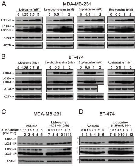 The effects of the local anesthetics on autophagosome-related protein expression in MDA-MB-231 and BT-474 cells. (A) MDA-MB-231 and (B) BT-474 (3 × 105) cells were treated with the indicated concentrations of lidocaine (1.25, 2.5, and 5 mM), levobupivacaine (0.5, 1, and 2 mM), bupivacaine (0.5, 1, and 2 mM), and ropivacaine (0.5, 1, and 2 mM) for 24 h; (C) MDA-MB-231 and (D) BT-474 cells were pre-treated for 2 h with 0, 0.1, 0.5, 1, 2, and 5 mM of 3-MA and then combined with 1.25 mM of lidocaine for 24 h. The cell lysates were subjected to Western blotting analysis using antibodies against the indicated proteins. ACTN was used as the protein loading control.