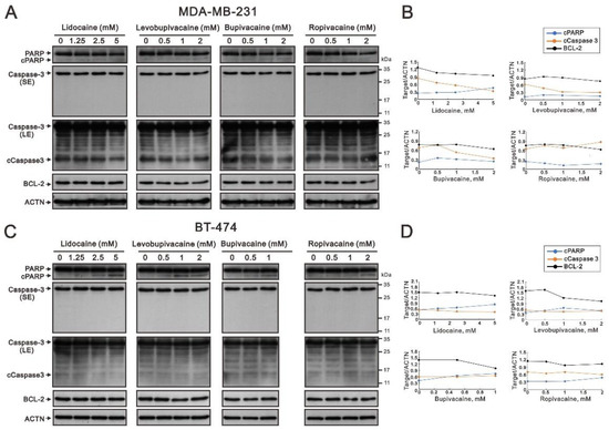 The effects of the local anesthetics on apoptosis-related protein expression in MDA-MB-231 and BT-474 cells. (A) MDA-MB-231 and (C) BT-474 (3 × 105) cells were treated with the indicated concentrations of lidocaine (1.25, 2.5, and 5 mM), levobupivacaine (0.5, 1, and 2 mM), bupivacaine (0.5 and 1 mM), and ropivacaine (0.5, 1, and 2 mM) for 24 h. The cell lysates were subjected to Western blotting analysis using antibodies against the indicated proteins. ACTN was used as the protein loading control. SE: shorter exposure; LE: longer exposure. (B,D) The protein bands (A,C) were quantified through pixel density scanning and evaluated using ImageJ, version 1.44a (http://imagej.nih.gov/ij/) (accessed on 4 December 2022). The ratios of protein/ACTN, including cPARP, cCaspase 3, and BCL-2) were plotted. The molecular weight markers are labeled with kDa.