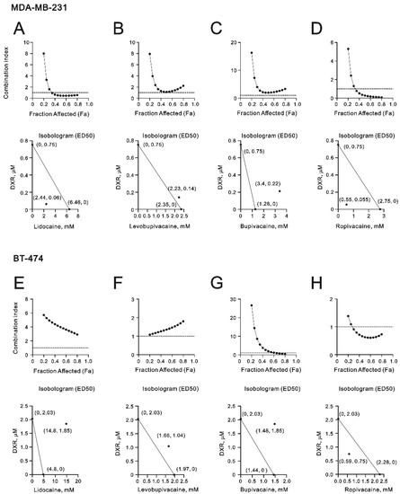 The combination indices of the local anesthetics with DXR in MDA-MB-231 and BT-474 cells. (A–H) The combination indices of DXR plus lidocaine, levobupivacaine, bupivacaine, and ropivacaine in (A–D) 1.5 × 104 MDA-MB-231 cells and (E–H) 2.5 × 104 BT-474 cells; (A–D) MDA-MB-231 cells were treated with various DXR doses (0, 0.01, 0.025, 0.05, 0.1, 0.25, 0.5, and 1 µM) combined with various lidocaine doses (0, 0.156, 0.3125, 0.625, 1.25, 2.5, 5, 10, 20, and 40 mM), levobupivacaine doses (0, 0.03125, 0.0625, 0.125, 0.25, 0.5, 1, 2, 4, and 8 mM), bupivacaine doses (0, 0.0156, 0.03125, 0.0625, 0.125, 0.25, 0.5, 1, 2, and 4 mM), and ropivacaine doses (0, 0.0625, 0.125, 0.25, 0.5, 1, 2, 4, 8, and 10 mM); (E,F, G, H) BT474 cells were treated with various DXR doses (0, 0.156, 0.3125, 0.625, 1.25, 2.5, 5, and 10 µM) combined with various lidocaine doses (0, 0.156, 0.3125, 0.625, 1.25, 2.5, 5, 10, 20, and 40 mM), levobupivacaine doses (0, 0.03125, 0.0625, 0.125, 0.25, 0.5, 1, 2, 4, and 8 mM), bupivacaine doses (0, 0.0156, 0.03125, 0.0625, 0.125, 0.25, 0.5, 1, 2, and 4 mM), and ropivacaine doses (0, 0.03125, 0.0625, 0.125, 0.25, 0.5, 1, 2, 4, and 8 mM) for 24 h. Metabolic activity was measured using the MTT method. The isobolograms (ED50) of lidocaine, levobupivacaine, bupivacaine, and ropivacaine were calculated using CalcuSyn software.