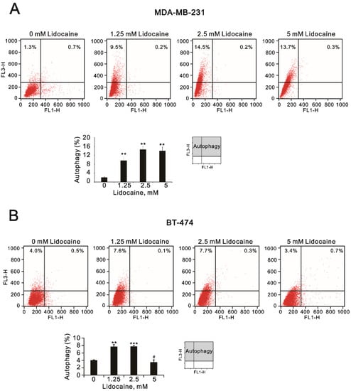 The effects of lidocaine on autophagy in MDA-MB-231 and BT-474 cells. Acidic vesicular organelles were detected and quantified using acridine orange staining and measured using flow cytometry analysis; (A) MDA-MB-231 and (B) BT-474 (3 × 105) cells were treated with the indicated concentrations of lidocaine (1.25, 2.5, and 5 mM) for 24 h. Acridine orange (1 µg/mL) staining was used to identify autophagic cells via FACS. The intensity of the red fluorescence (y-axis, FL3-H) was proportional to the degree of acidity and the volume of acidic vesicular organelles, including autophagic vacuoles. The values refer to the percentages of cells with a significant proportion of acidic vesicular organelles. The results are representative of two independent experiments. Bars depict the mean ± SD. # p > 0.05; ** p < 0.01; *** p < 0.001.