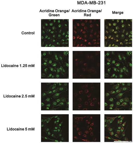 The detection of lidocaine-induced acidic vesicular organelles using acridine orange staining. MDA-MB-231 (3 × 105) cells were treated with the indicated concentration of lidocaine for 48 h before being stained with 1 µg/mL of acridine orange. The formation of acidic vesicular organelles was examined via fluorescence microscopy. Acridine orange is a weak base that accumulates in acidic spaces and results in bright red fluorescence (punctuation) in the cytoplasm, which can be detected by fluorescence microscopy. Scale bar = 100 µm.