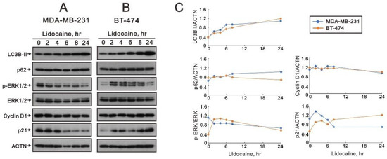 We further examined proteins associated with the induction time of autophagy formation by lidocaine in MDA-MB-231 and BT-474 cells. Our Western blotting data showed increasing trends in LC3BII and p62 and decreasing trends in the p-ERK/ERK ratio, cyclin D1, and p21 in MDA-MB-231 cells (Figure 11A,C). Increasing trends were observed in LC3BII, the p-ERK/ERK ratio, and p21 and decreasing trends in p62 and cyclin D in BT-474 cells (Figure 11B,C).
