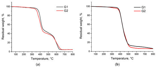 The thermal stability of hybrid dendrimers G1 and G2 was determined by thermogravimetric analysis (TGA) in air and in argon. Earlier [15], we found that the aromatic shell mainly determined the character of the thermal decomposition process in hybrid dendrimers composed of a flexible interior and rigid shell. For example, for the dendrimer in [15] composed of one generation of flexible carbosilane cores and two generations of rigid phenylene terminal blocks, the onset of the decomposition temperature was 100 °C higher than for the dendrimer composed of the same carbosilane core and one generation of the rigid polyphenylene shell. That is, the larger (thicker) rigid shell and the high decomposition temperature of the hybrid dendrimer. For dendrimers reported here, the weight-loss curves of both G1 and G2 dendrimers in air had two modes (Figure 1a). The first mode started at around 360 °C (5% weight loss) for G1 and 340 °C (5% weight loss) for G2 and was responsible for the decomposition of the carbosilane structure. At around 450 °C, the plateau was observed followed by the second stage onsets at 550 °C. The second stage of thermal decomposition was responsible for the decomposition of the aromatic outer layer of the dendrimers [21,22]. The process finished at 650 °C with a residual coke of 5%. The thermal stability of dendrimers in argon was slightly higher than in air, and the decomposition proceeded in one step starting from the 380–390 °C and finished at 600 °C with a residual coke of below 10% for both dendrimers. As in the case of TGA in air, the onset of the decomposition temperature for both dendrimers at 380 °C corresponded to thermal destruction of carbosilane bonds (Figure 1b). As one can see from TGA traces, the thermal decomposition of G1 and G2 proceeded in analogous manner. Thus, unlike abovementioned dendrimers synthesized by us in previous work [15], for G1 and G2 dendrimers in this study, there were no crucial differences in thermal stability. This is true for measurements in both air and in argon. Although the amount of the rigid terminal blocks increased proportionally with an increase in the generation of carbosilane cores, the ratio between of rigid and flexible components of the system remained constant for G1 and G2. We believe this is a key factor for the absence of the significant differences in the thermal decomposition behavior between dendrimers. At the same time, the differences in the TGA profiles in argon and air showed the contribution from oxidation in the decomposition process.