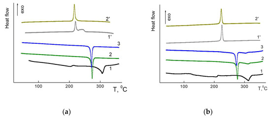 At the second heating–cooling cycle, the behavior of both dendrimers changed. While the peaks of cold crystallization were absent, the new obtained phases melted at lower temperatures (273–276 °C) than in the first cycles. Additionally, for G2, the residue effect of low intensity was observed at 311 °C, close to the first cycle melting. At cooling, the temperature peaks of crystallization mostly coincided with those of first cycle for both samples (Table 1, Figure 2). The ΔH of melting and crystallization for the first and second cycles also coincided for both dendrimers. However, it is worth noting that generally, in the second cycle, the ΔH was higher for G1 compared with G2, indicating a higher content of ordered phase in G1. In the third heating cycle, the phase behavior of both dendrimers coincided with that in the second cycle.