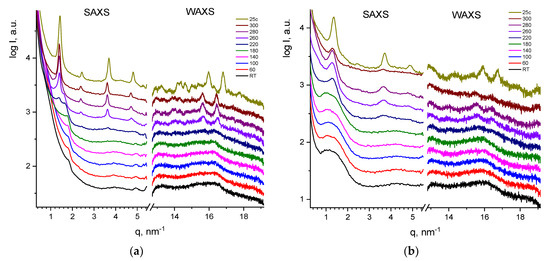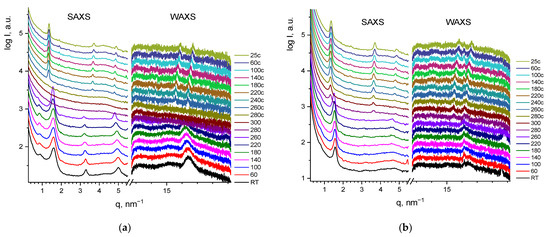 The as-received G1 and G2 showed only a small-angle reflection (SAXS) and a halo in wide angles, indicating weak ordering (Figure 3a,b). However, heating above 220 °C led to cold crystallization and resulted in a set of small- and wide-angle reflections, indicating the appearance of a powder crystalline pattern. Further, up to 300 °C, no structural changes in G1 were observed. However, for G2, one can observe the drop of the reflection intensity, indicating the onset of an isotropic state (Figure 3b).