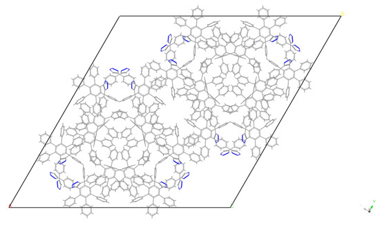 Interestingly, no considerable differences in the diffraction curves between the dendrimers of various generations was noted. Thus, it can be concluded that only the crystallization of the aromatic terminal groups occurred, while the flexible core did not participate in this process. The diffraction pattern of ~30 peaks was indexed as a hexagonal lattice of P6cc symmetry with a = b = 50 Å, and c = 11.6 Å with Rwp = 1.4%. The parameters of the cell did not change substantially with the varying of the core. While the diameters of G1 and G2 dendrimer molecules were roughly 62 and 68 Å, respectively, and the stacking length of such “propeller”-shaped functional aromatic groups is 9–10 Å as reported elsewhere [23,24,25], the flat organization of the molecules in the crystal cell can be assumed (Figure 6). The degree of crystallinity was roughly estimated at 50–57%. This value of crystallinity can be considered as a maximum of the crystallinity of the dendrimers synthesized. As can be seen from the DSC data (Table 1), the crystallinity for G2 was lower than that for G1. The calculation of the specific fusion heat with respect to the crystallizing shell content produced 46 J/g and 32 J/g, for G1 and G2, respectively. These results seem relevant because in the case of G1, the mass ratio of the crystallizing shell to the amorphous core was slightly larger than in case of G2. We assume that as the generation number of the flexible core increases, the crystallinity degree of the hybrid dendrimer will slightly decrease since the content of the amorphous part of molecules gradually increases relatively to crystallizing part.