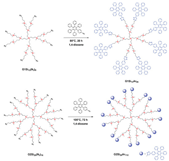 Synthesis of the hybrid dendrimers G1Si13Ar56 and G2Si29Ar112.