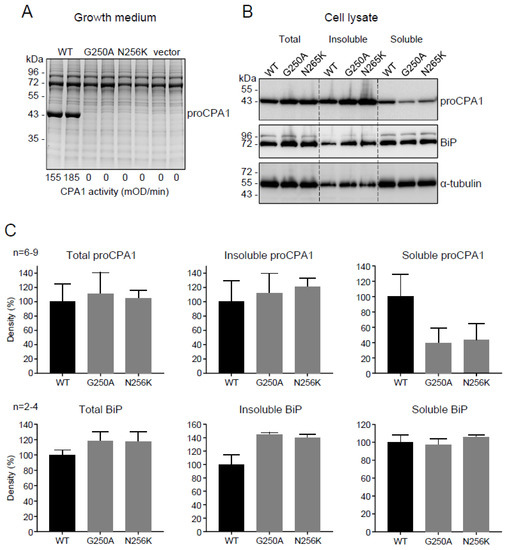 Protein levels of proCPA1 and immunoglobulin binding protein (BiP) were evaluated by Western blotting in total, soluble, and insoluble fractions of cell lysates. Ten µL of each fraction was analyzed per lane. As a loading control, human α-tubulin was measured. Incubation with the primary and secondary antibodies was performed overnight at 4 °C and for 1 h at room temperature, respectively. Protein bands were detected using the SuperSignal West Pico PLUS Chemiluminescent Substrate (34580, Thermo Scientific, Waltham, MA, USA). Rat monoclonal antibody against human carboxypeptidase A1 (MAB2856, R&D Systems Minneapolis, MN, USA) was used at 1:500 dilution. Mouse monoclonal antibody (DM1A) against α-tubulin (CP06, MilliporeSigma, St. Louis, MO, USA) was used at 1:2000 dilution. BiP was detected by a rabbit polyclonal anti-GRP78 antibody (ab21685, Abcam, Cambridge, MA, USA) used at 1:2000 dilution. Horse-radish peroxidase (HRP)-conjugated goat polyclonal anti-rat IgG (HAF005, R&D Systems, Minneapolis, MN, USA) was used at 1:1000 dilution. HRP-conjugated goat polyclonal anti-mouse IgG (HAF007, R&D Systems) was used at 1:2500 dilution. HRP-conjugated goat polyclonal anti-rabbit IgG (HAF008, R&D Systems) was used at 1:2000 dilution.