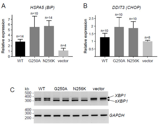 To evaluate the effects of the p.G250A mutation on CPA1 expression and function, we transiently transfected HEK 293T cells and measured the levels of secreted proCPA1 in the conditioned medium using SDS-PAGE and enzymatic activity assays. We used the known pathogenic mutant p.N256K as positive reference control, and cells transfected with empty vector served as negative control. We found that gels stained with Coomassie Blue showed strong bands for wild-type proCPA1 whereas no secreted protein was detected in the medium of cells transfected with p.N256K, p.G250A, or empty vector (Figure 1A). CPA1 activity of the conditioned medium was high after activation when cells were transfected with wild-type CPA1, but no activity was detectable in the medium of cells expressing the p.G250A and p.N256K mutants or containing empty vector (Figure 1A). Western blot analyses of cell lysates revealed that expression levels of wild-type proCPA1 were comparable to those of mutants p.G250A and p.N256K (Figure 1B,C). Separation of the cell lysates into soluble and insoluble fractions by centrifugation demonstrated that the p.G250A and p.N256K mutants were less soluble and had a higher tendency to form insoluble aggregates relative to wild-type proCPA1 (Figure 1B,C). The lack of secretion, intracellular retention, and higher propensity for aggregation suggested that CPA1 mutants p.G250A and p.N256K suffered misfolding. Consistent with this interpretation, cells expressing these mutants showed higher levels of the ER master chaperone BiP and contained more BiP in the insoluble fraction relative to cells transfected with wild-type CPA1 or vector only (Figure 1B,C). In agreement with the results of the Western blot analyses of the BiP protein, RT-qPCR also demonstrated that the CPA1 mutations induced considerable elevations in the mRNA levels for HSPA5 (BiP) (Figure 2A), and the ER-stress associated pro-apoptotic transcription factor DDIT3 (CHOP) (Figure 2B). Splicing of the transcription factor XBP1 mRNA was also markedly increased in cells transfected with mutant CPA1 constructs versus wild-type CPA1 or vector only (Figure 2C). Taken together, the observations indicate that the CPA1 mutation p.G250A causes enzyme misfolding and ER stress to the same extent as the known pathogenic mutation p.N256K. Thus, considering the clinical picture, mutation p.G250A should be classified as a pathogenic variant with respect to CP.