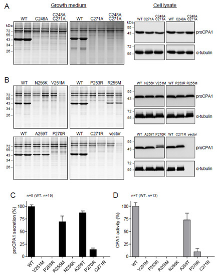 Effect of CPA1 variants on cellular secretion, intracellular protein levels, and enzyme activity. Secretion of proCPA1 protein from transfected HEK 293T cells was assessed by SDS-PAGE and Coomassie Blue staining. Protein levels of proCPA1 in cell lysates were analyzed by Western blotting. Alpha-tubulin was measured as loading control. (A) Effect of single Cys-mutations C248A and C271A, and double mutation C248A, C271A. (B) Effect of natural CPA1 variants p.V251M, p.P253R, p.R255M, p.N256K, p.A259T, p.P270R, and p.C271R. (C) Densitometric analysis of proCPA1 secretion to the growth medium. (D) CPA1 enzyme activity in the conditioned medium after activation of proCPA1. WT, wild-type.
