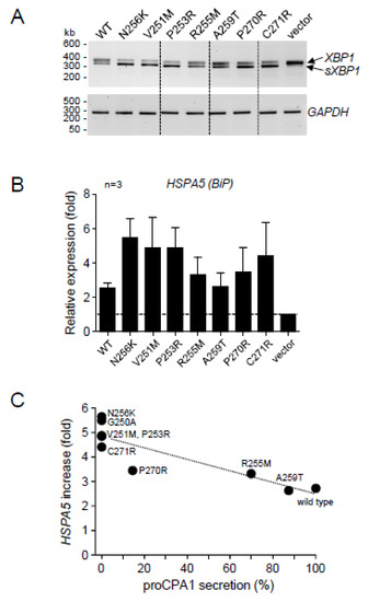 To evaluate the ER stress caused by the expression of the CPA1 mutants, we assessed splicing of XBP1 mRNA by RT-PCR and agarose gel electrophoresis (Figure 5A), and measured HSPA5 (BiP) mRNA levels by RT-qPCR (Figure 5B). Relative to cells transfected with empty vector only, wild-type and mutant CPA1 constructs induced varying levels of ER stress, which seemed inversely proportional to the amount of CPA1 secreted, i.e., directly proportional with the extent of the secretion defect. This was best visualized when the increase in HSPA5 (BiP) expression (fold change relative to cells transfected with vector only) was plotted as a function of CPA1 secretion (% of wild-type CPA1). In this analysis, the presumably pathogenic mutations, including p.G250A, clustered around the pathogenic reference mutation p.N256K in the upper left corner of the graph, characterized by the complete absence of secretion and around 5-fold increase in HSPA5 (BiP) expression (Figure 5C).