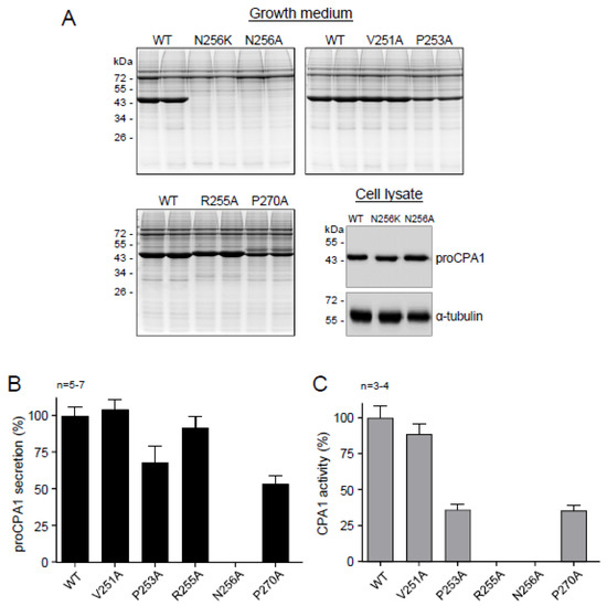 Effect of CPA1 Ala-variants on cellular secretion and enzyme activity. Secretion of proCPA1 protein from transfected HEK 293T cells was assessed by SDS-PAGE and Coomassie Blue staining. Protein levels of the p.N256A variant in cell lysates were analyzed by Western blotting. Alpha-tubulin was measured as a loading control. (A) Effect of CPA1 variants p.V251A, p.P253A, p.R255A, p.N256A, and p.P270A. For comparison, variant p.N256K was also included. (B) Densitometric analysis of proCPA1 secretion to the growth medium. (C) CPA1 enzyme activity in the conditioned medium after activation of proCPA1. WT, wild-type.