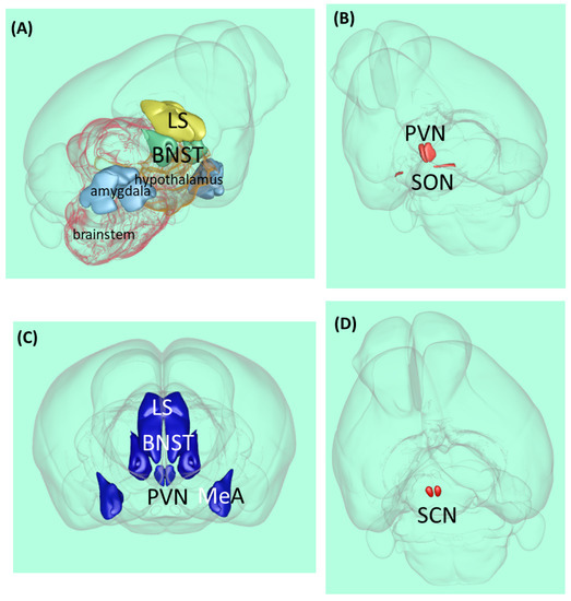 Vasopressin-related brain areas in the rodent brain. (A) Localization of the major V1a receptor-containing areas. (B) Magnocellular vasopressinergic cells. (C) Major parvocellular vasopressinergic cells. (D) Suprachiasmatic nucleus. Abbreviations: BNST—bed nucleus of stria terminalis, LS—lateral septum, MeA—medial amygdala, PVN—paraventricular hypothalami nucleus, SCN—suprachiasmatic nucleus, and SON—supraopticus nucleus [29].