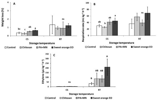 Impact of chitosan, phosphoric acid plus micronutrients (PA+MN), and sweet orange EO treatment on (A) weight loss (%), (B) respiration rate, and (C) ethylene production of strawberry fruit after three days of storage at RT (20 °C) and CS (4 °C). Error bars represent the standard deviation of the mean of three/six replicates. Treatments indicated with different letters for each storage condition differed significantly (Tukey’s honestly significant difference, at p ≤ 0.05), ns: not significant.