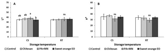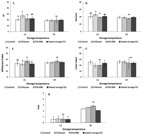 Effect of chitosan, phosphoric acid plus micronutrients (PA+MN), and sweet orange EO treatment and three days of storage at RT (20 °C) and CS (4 °C) on strawberry color parameters: (A) L* color, (B) a* color, (C) b* color, (D) Chroma value, (E) Whiteness index, (F) Color index, and (G) Hue angle. Error bars represent the standard deviation of the mean of three/six replicates. Treatments indicated with different letters for each storage condition differed significantly (Tukey’s honestly significant difference, at p ≤ 0.05); ns: not significant.