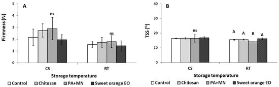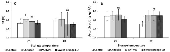 Effect of chitosan, phosphoric acid plus micronutrients (PA+MN), and sweet orange EO treatment on (A) firmness, (B) total soluble solids (TSS), (C) total acidity (TA), and (D) ascorbic acid (AA) of strawberry fruit after three days of storage at RT (20 °C) and CS (4 °C). Error bars represent the standard deviation of the mean of (three/six fruit) replicates. Treatments indicated with different letters for each storage condition differed significantly (Tukey’s honestly significant difference, at p ≤ 0.05); ns: not significant.