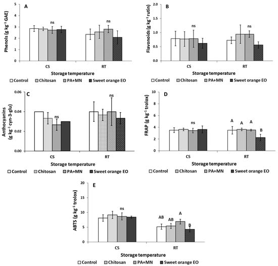 Effect of chitosan, phosphoric acid plus micronutrients (PA+MN), and sweet orange EO treatment and three days of storage at RT (20 °C) and CS (4 °C) on (A) total phenols, (B) total flavonoids, (C) anthocyanins, and (D,E) antioxidants (FRAP, ABTS). Error bars represent the standard deviation of the mean of (three/six fruit) replicates. Treatments indicated with different letters for each storage condition differed significantly (Tukey’s test significant difference, at p ≤ 0.05); ns: not significant.