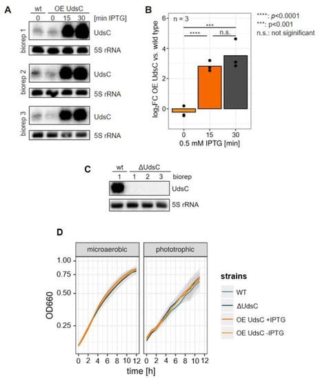 (A) Northern blots with total RNA (biological triplicates) from wild type (WT) or the UdsC-overexpression strain (OE UdsC) hybridized to an UdsC-specific probe (upper panels) or to 5S rRNA as loading control (lower panels). (B) The signals for UdsC were normalized to 5S rRNA and plotted for the different time points after IPTG addition. The bars represent the mean of the single measurements (dots), and the significance of the differences is indicated. (C) Northern blot from total RNA of the wild type (WT) and the strain deleted for UdsC (ΔUdsC) (biological triplicates) hybridized against UdsC (upper panel) or 5S rRNA (lower panel). (D) Growth curves of WT, UdsC knockout (ΔUdsC) and the overexpression strain (with or without IPTG added) under microaerobic and phototrophic conditions. The lines represent the mean of biological triplicates, and the standard deviations are indicated (shade).