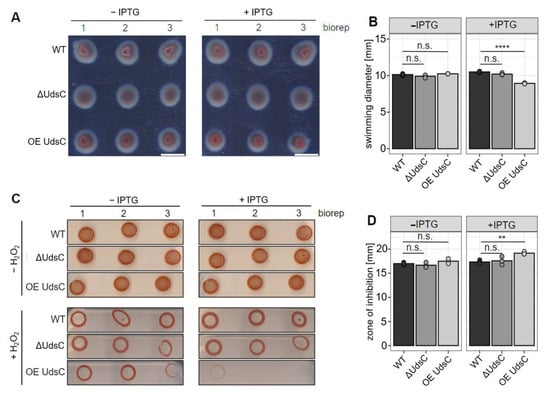 Since the RNAseq results revealed a strong effect of UdsC on motility genes, we performed swim assays with the different strains (Figure 3A). The quantification of triplicates from the swimming assays revealed a slight, but not significant, motility-stimulating effect of IPTG (Figure 3B). The ΔUdsC strain showed a similar motility to the wild type, while the motility of the overexpression stain was moderately, but significantly, decreased in the presence of IPTG (Figure 3B). This demonstrated, that UdsC indeed affected motility.