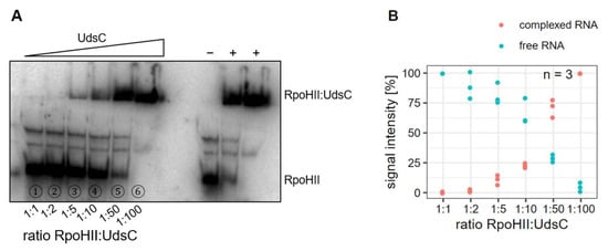 RNA was transcribed in vitro using T7 Polymerase (NEB) and PCR products as a template (primers listed in Table S2, which contained the T7 promoter region at the 5′ ends). Gel retardation assays were carried out with 150 fmol radio-labelled RpoHII transcript and various molar ratios of non-labelled UdsC transcripts in a final volume of 7.5 µL. RNAs were denatured separately for 1 min at 95 °C and renatured by cooling for 2 min on ice for 5 min at 32 °C. After these de- and renaturing steps, the radio-labelled and non-labelled RNAs were mixed, and 2 µL of 5× structure buffer (25 mM MgCl2 and 300 mM KCl) was added to a final volume of 10 µL. For complex formation of the RNAs, the samples were incubated together for 30 min at 32 °C. Afterwards, the reactions were mixed with 3 µL of loading dye (50% glycerol, 0.5× TBE, 0.2% bromophenol blue) and loaded onto a 6% non-denaturing polyacrylamide gel containing 0.5× TBE. Gels were pre-run at 100 V for 60 min at room temperature before loading. Electrophoresis was performed at room temperature by applying 200 V for 4 h. Gels were dried and exposed on phosphoimaging screens.
