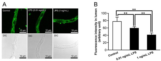 Alterations in P-gp activity in the retinal capillaries after LPS treatment. (A) Representative confocal images of isolated rat retinal capillaries after incubation with 4 μM NBD-CSA for 60 min. The capillaries were preincubated with ECF buffer in the absence (control) or presence of LPS at a concentration 0.01 or 1 ng/mL for 30 min. (B) Quantification of NBD-CSA fluorescence in the lumens of retinal capillaries. Each column represents the mean value for 10 capillaries from a single preparation; variability is given by S.D. bars. Units are expressed as arbitrary fluorescence (scale 0–255). ** p < 0.01, significantly different between the groups. Capillary images were captured using a TCS-SP5.