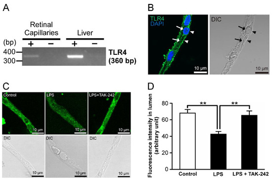 LPS is known as a ligand for TLR4 [17]. In the RT-PCR analysis, amplified products of TLR4 mRNAs were detected in the retinal capillaries (Figure 2A). In addition, immunoreactivities of TLR4 proteins were detected on both the luminal (arrows) and abluminal (arrowheads) membranes of the retinal capillary endothelial cells (Figure 2B). With the addition of TAK-242, a TLR4 inhibitor [18], at a concentration of 1 µg/mL and LPS, luminal NBD-CSA fluorescence was increased to that in control (Figure 2C,D).