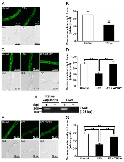 Since TLR4 activation has been reported to induce TNF-α secretion from microvascular endothelial cells [19], it is hypothesized that TNF-α is involved in the reduction in P-gp activity as the downstream effector of TLR4 signaling. By 1 ng/mL TNF-α treatment, NBD-CSA fluorescence in the lumens of rat retinal capillaries was significantly decreased by 38% (Figure 3A,B). In addition, the reduction in luminal NBD-CSA fluorescence by LPS treatment was restored to the control level in the presence of 20 µM WP9QY, which is a TNF-α antagonist [20] (Figure 3C,D). TNF-α has been reported to be converted from a membrane-bound form to soluble form by TNF-α converting enzyme (TACE) [21]. In the RT-PCR analysis, amplified products derived from TACE mRNAs were observed in the retinal capillaries (Figure 3E). Moreover, cotreatment with 400 nM TAPI-0, a TACE inhibitor [22], and LPS significantly restored the luminal accumulation of NBD-CSA under LPS-treated conditions (Figure 3F,G).