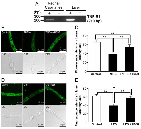TNF-α has been known as a ligand for TNF-R1 [23]. In the RT-PCR analysis, TNF-R1 mRNAs were amplified in isolated rat retinal capillaries (Figure 4A). In the presence of 10 µg/mL H398, a specific TNF-R1 antagonist [24], with TNF-α or LPS, NBD-CSA accumulation in the lumens of retinal capillaries was significantly restored compared with the luminal NBD-CSA accumulation under TNF-α or LPS-treated conditions (Figure 4B–E).