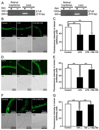 ETB receptor-mediated P-gp attenuation in the retinal capillaries under LPS-treated conditions. (A) mRNA expression of ETA receptor or ETB receptor in rat retinal capillaries. RT-PCR analysis was performed in the presence (+) or absence (−) of reverse transcriptase using specific primers for ETA receptor or ETB receptor. The rat liver was used as the positive control. (B,D,F) Representative confocal images of isolated rat retinal capillaries after incubation with NBD-CSA at 4 μM for 60 min. The capillaries were preincubated with 1 ng/mL LPS or 1 ng/mL TNF-α in the absence or presence of BQ-123 (ETA receptor antagonist) at 30 nM, or BQ-788 (ETB receptor antagonist) at 10 nM for 30 min. (C,E,G) Quantification of NBD-CSA fluorescence in the lumens of retinal capillaries. Each column represents the mean value for 10 capillaries from a single preparation; variability is given by S.D. bars. Units are expressed as arbitrary fluorescence (scale 0–255). ** p < 0.01, significantly different between the groups. Capillary images in (D) were captured using a TCS-SP5, and those in (B,F) were captured using a LSM 900.