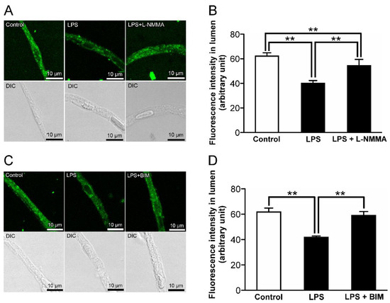 The effects of inhibitors for nitric oxide synthase (NOS) and protein kinase C (PKC) on the decrease in P-gp-mediated transport activity in the retinal capillaries by LPS. (A,C) Representative confocal images of isolated rat retinal capillaries after incubation with NBD-CSA at 4 μM for 60 min. The capillaries were preincubated with LPS at 1 ng/mL in the absence or presence of L-NMMA (NOS inhibitor) at 30 μM or BIM (PKC inhibitor) at 40 nM for 30 min. (B,D) Quantification of NBD-CSA fluorescence in the lumens of retinal capillaries. Each column represents the mean value for 10 capillaries from a single preparation; variability is given by S.D. bars. Units are expressed as arbitrary fluorescence (scale 0–255). ** p < 0.01, significantly different between the groups. Capillary images were captured using a TCS-SP5.