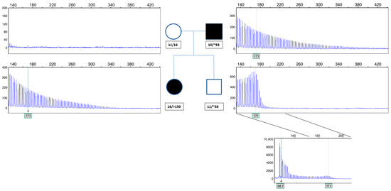 In total, 561 patients, 434 (77.4%) with DM1 (209 males, 48.2% and 225 females, 51.8%) and 127 (22.6%) with DM2 (56 males, 44.1% and 71 females, 55.9%) were included in the present study (Table 1). Prenatal tests were recorded in 13 cases, of which three were found to have expansions. In one of the fetuses, a protomutation of 63 repeats originated from a maternal allele with 58 repeats. Expansions were also noticed in 17 families in the range of premutations (36–50 CTG repeats) or protomutations (51–80 CTG repeats) through transmission from unaffected parents. In another case, an allele of 100 repeats was contracted to 38 repeats (Figure 1). In total, from 30 parent–child pairs tested, 7 individuals were positive for premutations (4 families) and 25 for protomutations (13 families) (Table 2). In all cases of paternal transmission, expansions exceeded 150 repeats. Upon maternal transmission, only one expansion from 74 to >150 repeats was recorded, while the remaining three presented with a small expansion of up to 6 CTG repeats.