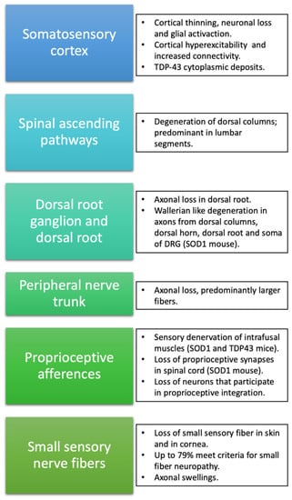 Pathological studies confirmed that the degeneration of the dorsal columns occurs in up to half of patients, especially in lumbar regions, including both genetic (SOD1) and sporadic forms [86,87,88,89,90,91,92,93,94,95,96,97,98,99,100]. The predominant involvement of lumbar spinal cord segments in both functional and pathological examinations suggests an axonal length-dependent degeneration, taking as a starting point cortical and subcortical brain structures, as suggested by the corticofugal propagation proposed by Braak [77]. Supporting this hypothesis of cortical influence in the degeneration of spinal sensory ascending axons is the fact that dorsal column degeneration is less frequent (8%) in pure progressive muscular atrophy (PMA) and in those patients that progress to ALS (30%).