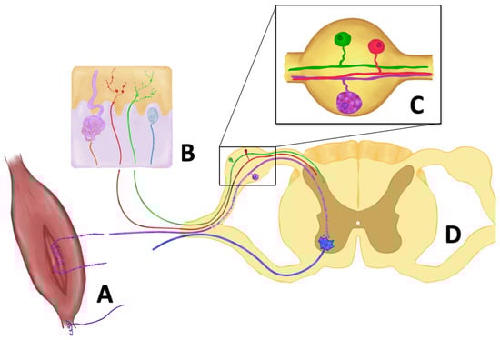Main pathological changes in sensory afferents reported in ALS. (A) Degeneration of type Ia and II sensory fibers innervating muscle spindles, while type Ib fibers (Golgi tendon organ) are preserved. (B). Reduction of intraepidermal nerve fibers, terminals of both peptidergic (red) and non-peptidergic (green) axons, with focal swellings. Meissner corpuscle innervation (blue) is also impaired, as well as sympathetic fibers innervating sweat glands (brown). (C) In the dorsal root ganglion, neuronal bodies are preserved, although vacuolization and accumulation of misfolded SOD1 protein are seen in proprioceptive neurons (purple). (D) In the dorsal root, larger axons show Wallerian degeneration. In addition, proprioceptive synapses in the anterior horn are reduced in certain animal models (SOD1G93A mouse) but preserved in others (TDP43A315T mouse).
