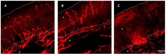 Intraepidermal nerve fiber (IENF) density from wild-type (A), SOD1G93A mice of 8 (B), and 16 weeks (C). Dotted lines mark the limits of the epidermis (e) and dermis (d). IENF fibers are marked with PGP9.5 and show a decrease over time in the SOD1G93A mouse. Reprinted/adapted with permission from [167], 2016, John Wiley and Sons.