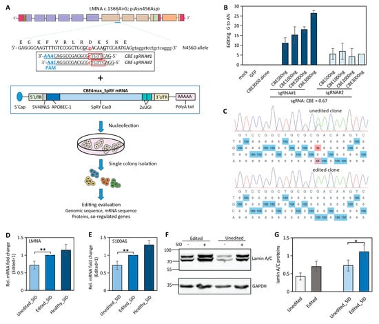- Koblan, L.W.; Erdos, M.R.; Wilson, C.; Cabral, W.A.; Levy, J.M.; Xiong, Z.M.; Tavarez, U.L.; Davison, L.M.; Gete, Y.G.; Mao, X.; et al. In vivo base editing rescues Hutchinson-Gilford progeria syndrome in mice. Nature 2021, 589, 608–614. [Google Scholar] [CrossRef] [PubMed]