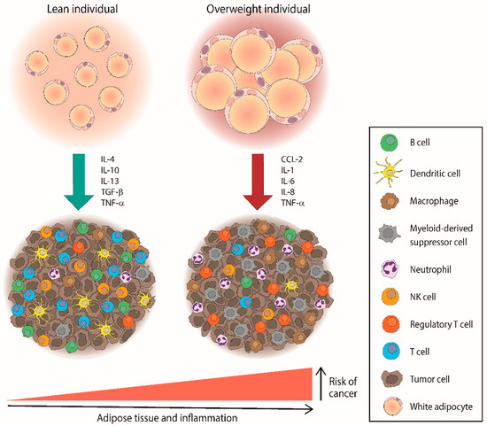 By contrast, the tumor necrosis factor (TNF)-α is also secreted by adipose tissues, and its levels correlate with the degree of adiposity [123], but its role in cancer remains controversial [124,125,126]. However, the role of anti-TNF-α therapies in increasing the risk of lymphoma has been described and seems clear in patients with autoimmune diseases, such as inflammatory bowel disease [127] or rheumatoid arthritis [128,129].