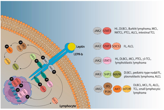 Leptin signaling pathways that could promote different types of lymphoma. ALCL—anaplastic large cell lymphoma; DLBCL—diffuse large B-cell lymphoma; FL—follicular lymphoma; HL—Hodgkin lymphoma; MCL—mantle cell lymphoma; NKTCL—natural killer/T-cell lymphoma; PTCL—peripheral T cell lymphoma; TCL—T-cell lymphoma.