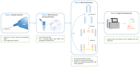 DNA analysis workflow and improvement for low template DNA. In sample collection, the correct swab should be chosen, and, in particular, collection through a single swab should be performed on non-porous surfaces; the use of tape lifting is a preferred option for porous surfaces. Moreover, in this step, the moistening agent is also of fundamental importance to improve the final results (Step 1). Other possible solutions to improve the DNA analysis of low template DNA consist of the concentration of the DNA after its extraction or in the use of reducing agent lysis buffer with a prolonged time of incubation to increase, in both cases, the concentration of the final extracted DNA in the reaction volume (Step 2). The following step of DNA amplification may be modified in different ways to improve the DNA analysis in the case of low-template DNA. It is possible to increase the number of PCR cycles, decrease the PCR reaction volume to further concentrate the amount of DNA, or perform an additional purification step of the amplicons (Step 3). Eventually, it is possible to also intervene in the last step of fragments sequencing by increasing the time and the tension for the injection of the DNA fragments into the sequencer (Step 4).