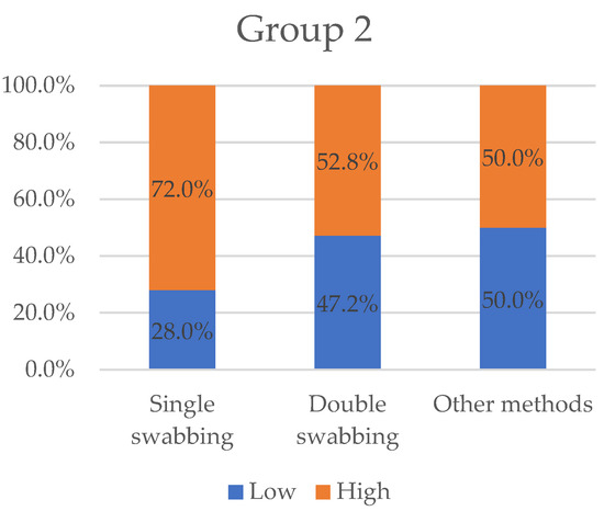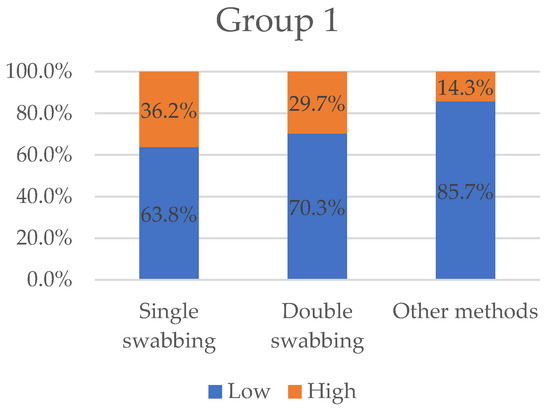 Variables “low” and “high” grouped by sampling methods for Group 1. With 36.2%, single-swabbing obtains the greatest “high” value, followed by double-swabbing (29.7%), and other methods (14.3%).