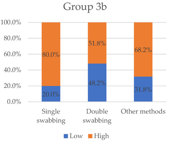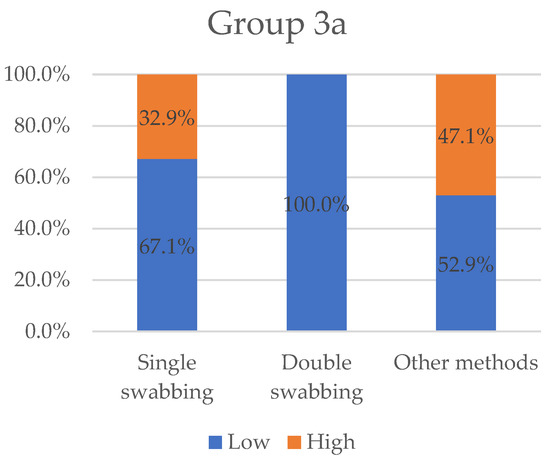 Variables “low” and “high” grouped by sampling methods for Group 3a. “Low” value represents the totality of results collected for double-swabbing. Single-swabbing and other methods obtained 67.1% and 52.9%, respectively.