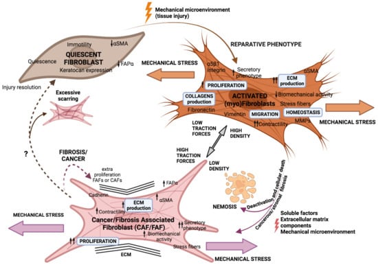 Fibroblasts’ phenotype adapts in response to external aggression. Activation of quiescent fibroblasts to a myofibroblast phenotype to repair tissue damage by wound healing is triggered by microenvironmental signals. Myofibroblasts should disappear by apoptosis (nemosis) after punctual aggression, but if fibroblasts are subjected to constant stress, they could evolve into a FAF or CAF phenotype.