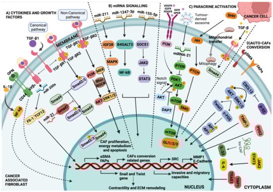 Major pathways involved in CAF development. (A) Cytokines and growth factors: Regulation of CAF-specific gene expression through TGF-β signalling via Smad-dependent and Smad-independent pathways. In the canonical pathway, Smad2/3-Smad4 translocate to the nucleus and bind to a specific DNA sequence, being possibly inhibited by Smad7. In the non-canonical pathway, TGF-β promotes the activation of several signalling pathways, other than Smad, including PI3K kinases, MEK, and Rho-Rock, among others. (B) miRNAs signalling: miRNAs and lncRNAs transform NAFs into CAFs through downstream signalling involving JAK/STAT, NF-κβ, and MAPK cascades. (C) Paracrine activation: Through the PDK1/AKT signalling pathway, in which tumour exosome miRNA-21 inhibits it and PI3K promotes it. Notch signalling via AKT signalling pathway controls AKT phosphorylation and mTOR activation. As a result, mTOR regulates the expression of targeted genes associated with differentiation into CAFs; in addition, expression of tumour cell-derived SHH has been confirmed to modulate CAFs via paracrine activation of HH signalling, and the overexpression of SMO in CAFs contributes to HH signal transduction and GLI1 activation. Fibroblasts can also be metabolically reprogrammed via cancer cell-derived mitochondrial transfer and the TGF-β signalling pathway derived from cancer cells. (D) Auto CAFs-conversion: A self-propelled conversion induced by changes in cellular homeostasis, which controls the activation of cytoskeletal proteins and the secretory phenotype via the YAP1/TEAS1 and JAK2/STAT3 signalling pathways. EMT is facilitated by an activated CXCL12 signal via the ERK/AKT-Twist1-MMP1 pathway. TIMP-1 is related to collagen contractility and CAF proliferation and migration through the ERK1/2 signalling pathway in CAFs (Table 1).