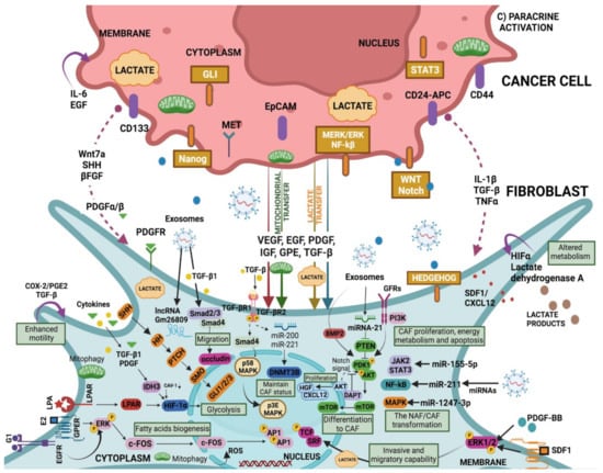 CAF “education” by the cancer-derived factors (extension of section C) in Figure 2). Cancer-derived exosomes carry elements such as miRNA and lncRNA that promote the transformation of NAF to CAF through downstream signals that include cascades such as TGF-β/Smads, JAK/STAT, NF-κB, and MAPK. NAF-CAF conversion may also be driven by the reprogramming of glucose metabolism and the HIF-1α signalling pathway involved in glycolysis. Both the canonical TGF-β signalling pathway (TGF-β/Smads) and the non-canonical pathway (with activation of TGF-β but not Smads) are actively involved in the malignancy of NAFs. In CAFs, while miRNA-21 can attenuate the inhibition of PTEN on PDK1/AKT, the receptor–ligand binding-activated PI3K can promote it. As a result, through the PDK1/AKT signalling cascade mTOR protein is transported into the nuclei, and subsequently, the mTOR protein regulates the expression of targeted genes associated with CAFs differentiation. Notch signalling pathway is also involved in CAF differentiation via AKT. In turn, CAF-mediated PI3K/AKT signalling pathway regulates cell proliferation, migration, and stemness in cancer cells. EGFR/ERK signalling in CAFs is stimulated by E2 and G1 and upregulates fatty acids metabolism. Further, PDGF-BB and SDF-1 stimulate a higher invasive and migratory capability of CAFs via ERK1/2 phosphorylation (Table 1).