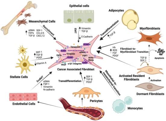 Although all fibroblasts present in a tumour are defined as CAFs, they come from diverse cell sources [115]. We have already described above how resident fibroblasts are activated to become CAFs, but other cell types within the tissue also undergo a transformation that ends in an induced cell differentiation toward CAF-like cells. It is becoming evident that the origin of CAFs may vary between different tumour histotypes, and within different areas of the same tumour, and this origin may be critical in determining the degree of CAFs malignancy [5,152,153] (Figure 4).