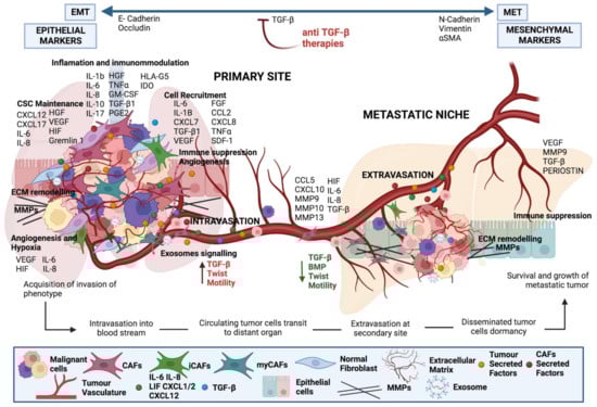 Interestingly, the key role of CAFs as chaperons in metastasis is becoming more widely accepted. CAFs facilitate intravasation and extravasation and escort and sustain neoplastic cells within the blood stream on their way to metastatic sites [173,236,237] (Figure 5). Recent in vivo studies have shown that metastatic cells have greater viability when they are accompanied by their own stromal elements, while when CAFs are depleted, there is a marked decrease in the number of lung metastases [238]. Invasive tumours in colon cancer patients have also been shown to be enveloped by a layer of CAFs during invasion [239]. Aiello et al. demonstrated that fibroblasts appear in distant metastases with 6-7 cells and that the goal of the final metastasis is to reach a stromal volume of the dimensions of the primary tumour [240].