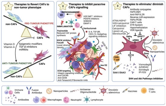 CAFs reprogramming, as well as short-term inhibition of CAFs-predominant signalling pathways, have been recognized as better strategies than complete ablation or chronic inhibition. Indeed, several studies have found that strategies aimed at CAF ablation are ineffective [275,302].