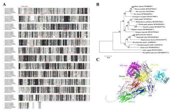 Sequence analysis of OnC3 and 3D structure diagram of OnC3 protein. (A) Multiple sequence alignment of the deduced amino acid sequences of C3 among different species. GenBank accession numbers of the used species for comparison are Homo sapiens (NP_000055.2), Mus musculus (NP_033908.2), Bos taurus (NP_001035559.2), Gallus (NP_990736.3), Xenopus laevis (XP_031755344.1), and Maylandia zebra (XP_014265945.2), respectively. The conservative motifs were highlighted in red box, including important domains such as A2M_N, A2M_N_2, ANATO, A2M, A2M_comp, A2M_recep, and C345C. (B) Phylogenetic tree of C3 family members constructed using the NJ method by MEGA 7.0 program based on the alignment of 19 members performed with the Clustal W method. Numbers at each branch indicate the percentage bootstrap values on 1000 replicates. The red triangle represents O. niloticus C3 gene cloned in this study. (C) The 3D structure diagram of OnC3 protein. Alphfold was used for protein structure prediction, and Pymol was used for software drawing. Different domains of OnC3 protein are distinguished by different colors.