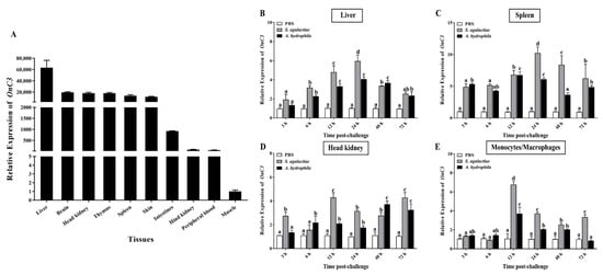 (A) Tissue distribution pattern of OnC3 transcript in healthy Nile tilapia. The expression of OnC3 in different tissues is compared to that in the muscle and normalized against the expression of β-actin. (B–D) Expression of OnC3 transcript in the S. agalactiae (1 × 107 CFU/mL) or A. hydrophila (1 × 107 CFU/mL) challenged tissues (liver, spleen, and head kidney). The expression of OnC3 was normalized to β-actin, and the multiple changes in OnC3 in each tissue were calculated deciding that in the PBS-immunized group. (E) Expression of OnC3 in the MO/Mø after stimulation with inactivated S. agalactiae (1 × 107 CFU/mL) and A. hydrophila (1 × 107 CFU/mL). The error bars represent standard deviation (n = 3), and the significant differences are indicated by different letters (a, b, c, d) (p < 0.05).