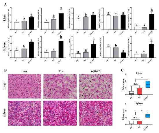 The effects of (r)OnC3 on tilapia inflammatory response in vivo. (A) The mRNA expressions of inflammatory cytokines IL-1β, IL-6, and TNF-α and anti-inflammatory cytokines IL-10 and TGF-β in the liver and spleen of tilapia were detected at 12 h after treated with (r)OnC3 protein (50 µg/mL). The control groups were treated with 10 mM sterile PBS and Trx protein (50 µg/mL). (B) (r)OnC3 promoted inflammatory infiltration in the liver and spleen by H&E staining (×400). (C) The injury score of the liver and spleen. The error bars represent standard deviation (n = 3), and the significant differences are indicated by different letters (a, b, c) (p < 0.05) and asterisks (n.s. 0.05 < p, * 0.01 ≤ p < 0.05).