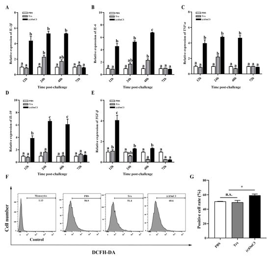 The effects of (r)OnC3 on tilapia MO/Mø inflammatory response and ROS in vitro. (A–E) The mRNA expressions of inflammatory cytokines IL-1β, IL-6, and TNF-α and anti-inflammatory cytokines IL-10 and TGF-β were detected from Nile tilapia MO/Mø at 12 h, 24 h, 48 h, and 72 h after treatment with (r)OnC3 protein (50 µg/mL). The control groups were treated with 10 mM sterile PBS and Trx protein (50 µg/mL). (F) Flow cytometric analysis of the MO/Mø ROS preincubated with PBS, Trx, or (r)OnC3 (50 µg/mL). The histogram result shows the DCFH-DA intensity of the circled myeloid gate cells, and 10,000 cells were analyzed. (G) The percentage of positive head kidney MO/Mø was analyzed by flow cytometry. The error bars represent standard deviation (n = 3), and the significant differences are indicated by different letters (a, b, c) (p < 0.05) and asterisks (n.s. 0.05 < p, * 0.01 ≤ p < 0.05).